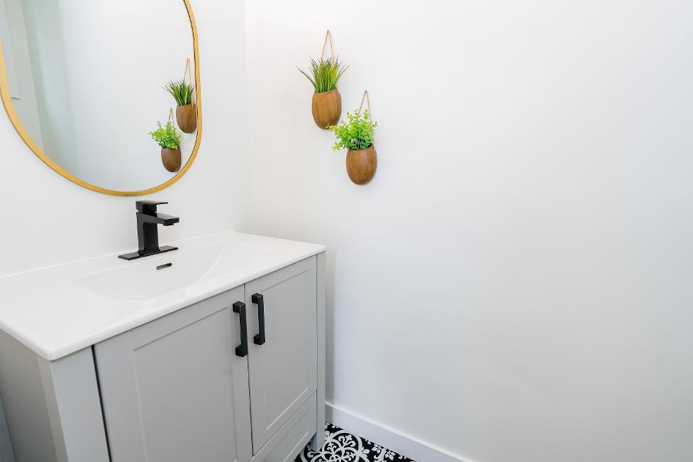 - Updated light-toned vanitywith sleek blackhardware