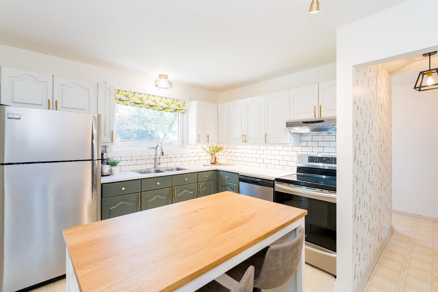 - Updated with quartz-looklaminate countertops,a subwaytile backsplash,gold hardware,and two-toned cabinetry