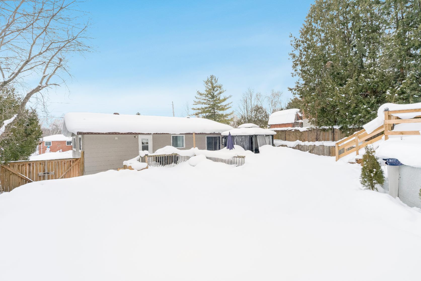 - Fullyfenced backyard featuring a newdeckthat wrapsaround the