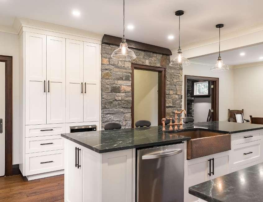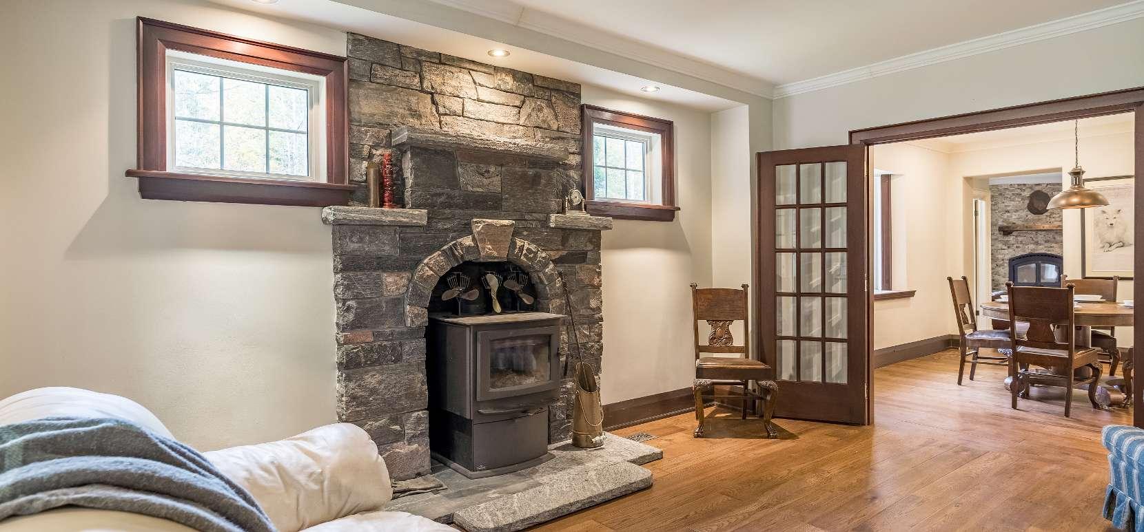 - Wood-burning airtight Napoleon stove surrounded bycustom hand cut granite