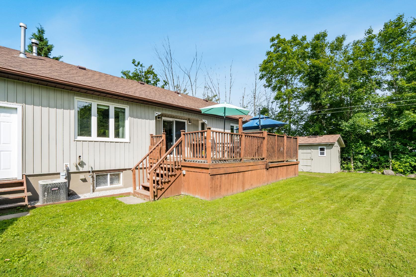 surrounded bylush greenery,where you'llfind a spacious2-tiered deck, a firepit,an above ground pooland equipment,and a garden shed