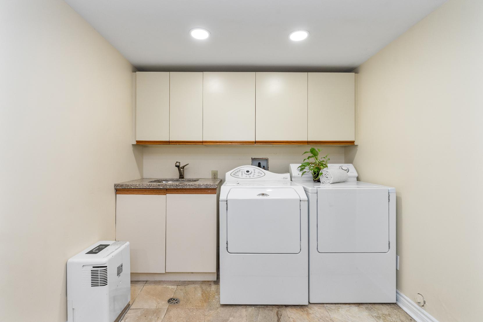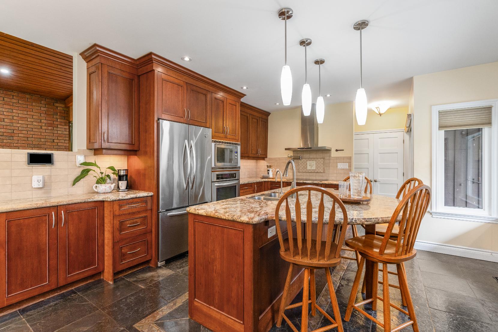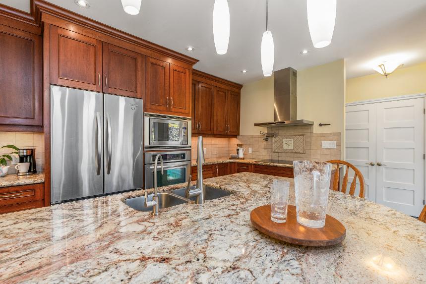 - Abundance of warm-toned cabinetryfinished with undermount lighting and crown moulding detailing