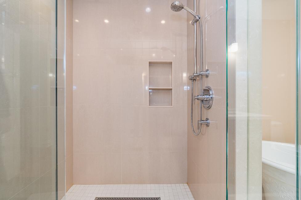 - Walk-in glassshowerboasting a tiled surround,a built-inniche,a rainfallshower head,and a handheld showerhead