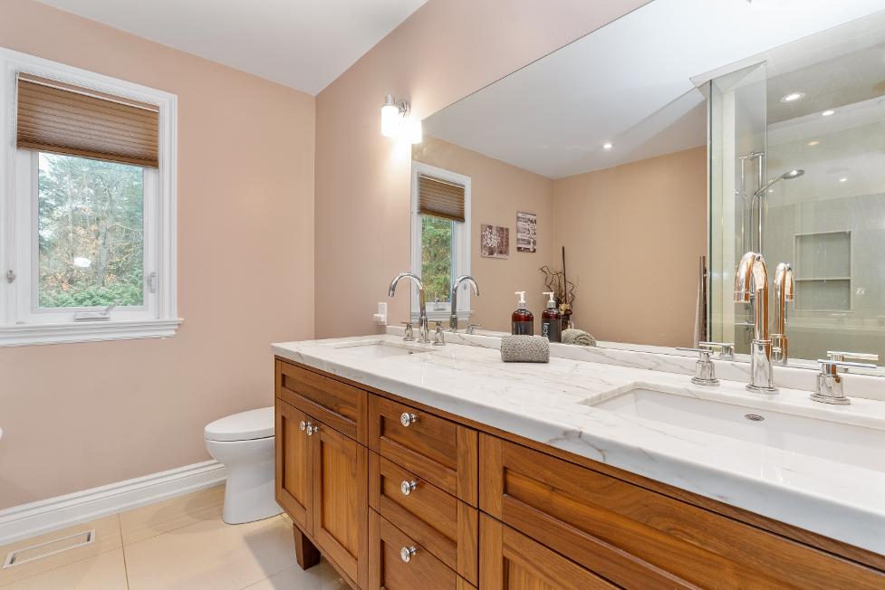 - Dualsinkvanityflaunting a sleekquartz countertop and under-the-sinkcabinetry