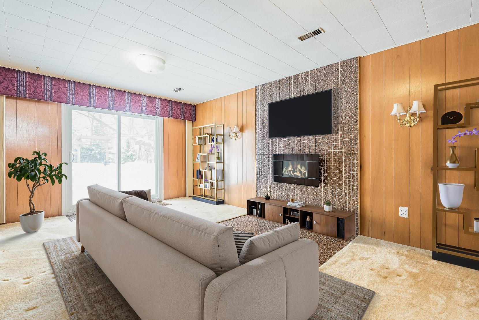 - Wood paneled wallsanchored byan accent wall,perfect fora fireplace ora mounted TV