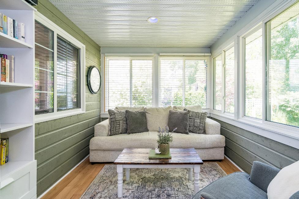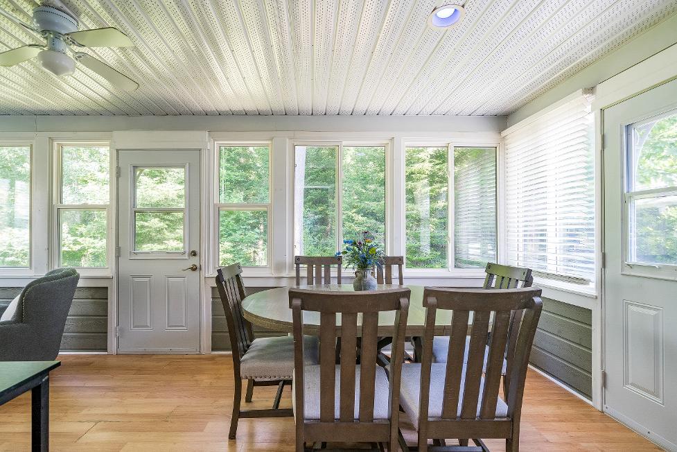 - Arrayof surrounding windowsincluding a windowoverlooking the sunroom