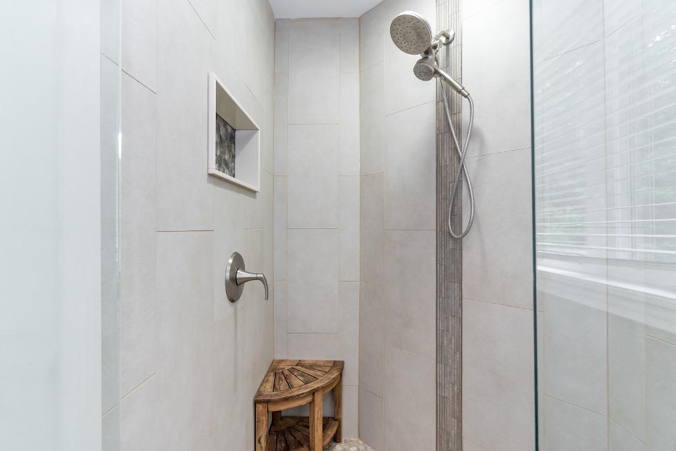 - Walk-in showerpaired with a tiled surround,handheld shower head,a built-in niche,and a glass-door