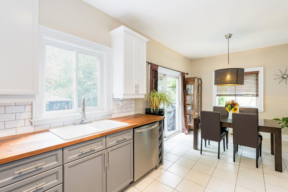Atrue chef?sdelight with stainless-steelappliances,a butcherblockcountertop,a classic subwaytiled backsplash,and tall cabinetrywith crown moulding detailing,meanwhilethe adjoining dining room featureswalkout accessto the deck,enhancing indoorand outdoorliving with ease