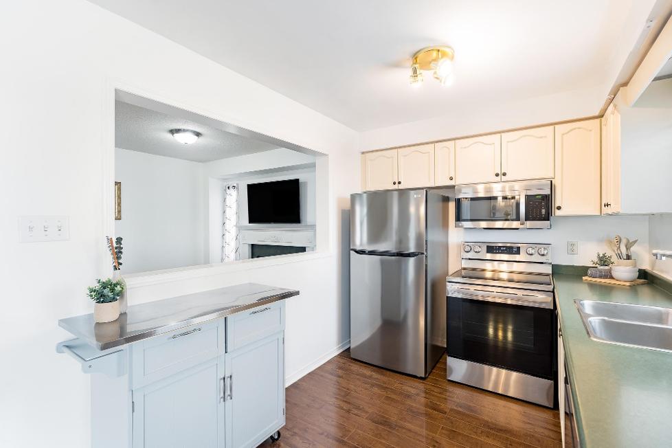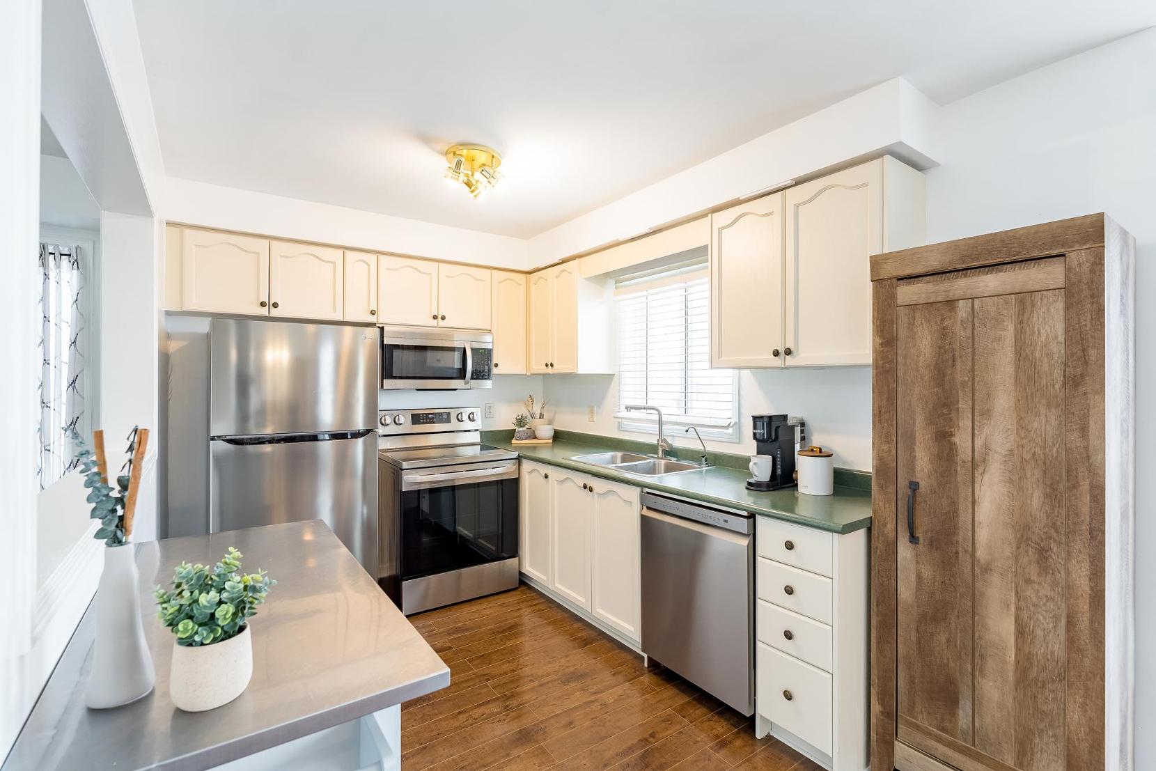 Tastefullyupdated throughout,featuring a custom maple staircase(2023), newerstainless-steelappliancesupstairs(2023),aswellasan upgraded centralairconditioner,furnace,humidifier,and hot watertank (2015),plus newerroof,flooring,and more