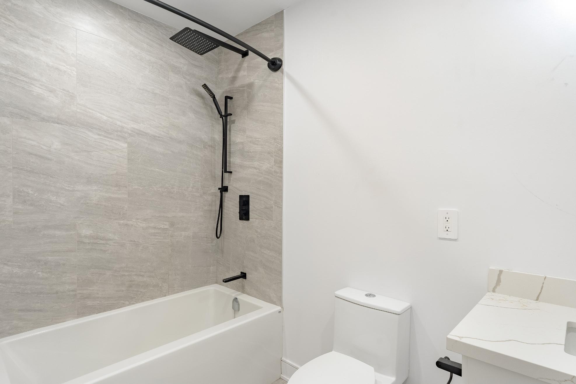 - Combined bathtub and showershowcasing a tiled surround,a rainfallshowerhead,a handheld showerhead,and a recessed light