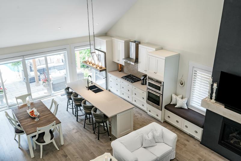 Open-concept main levelshowcasing lush finishesincluding a soaring 22'ceiling, a chef inspired kitchen,oversized windows,and a floor-to-ceiling fireplace