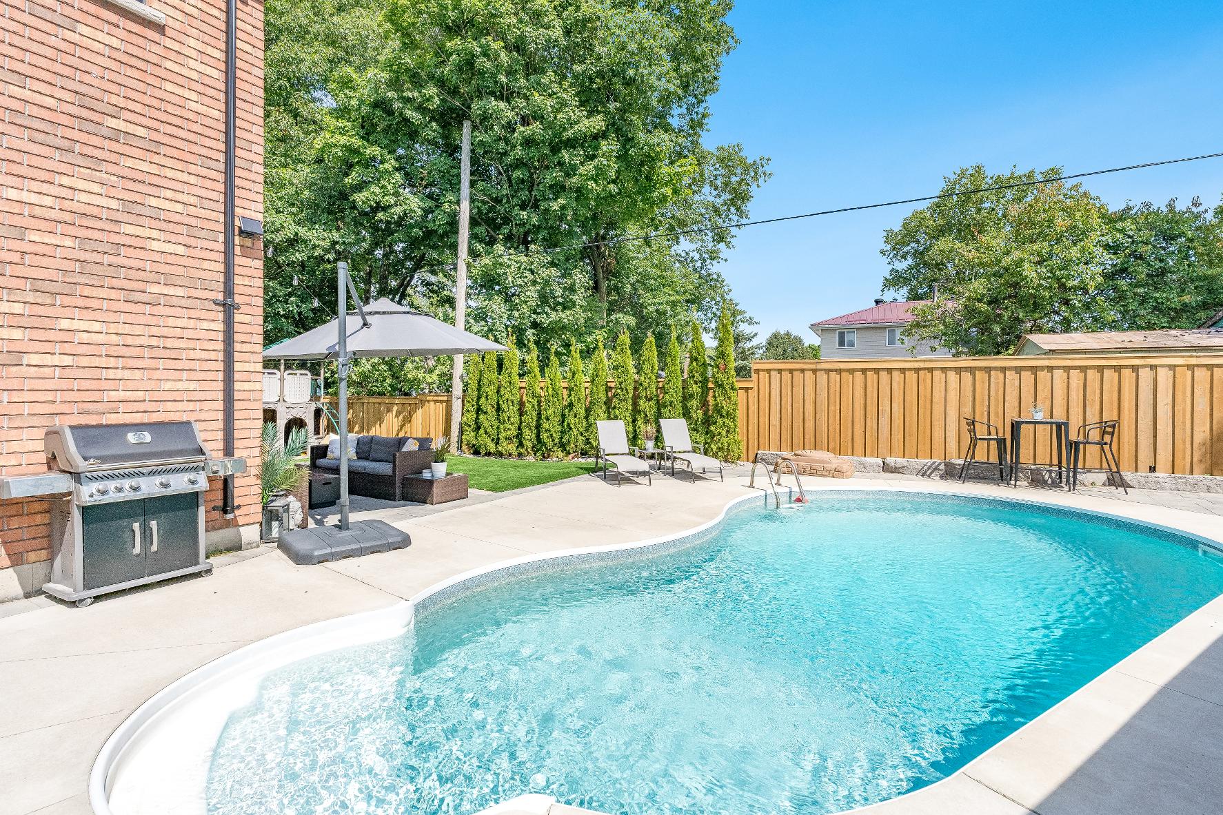 Stunning backyard oasiswith a totalprivacyfence,a spacious patio,stone walkways,professionallandscaping,and an inground pool,perfect foroutdoorenjoyment