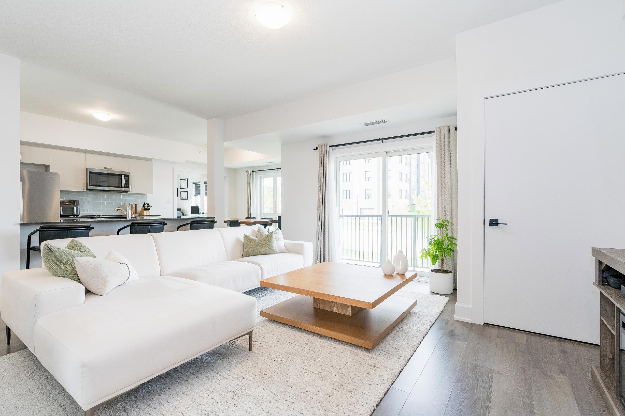 The expansive kitchen offersamplecounterspace and storage,whilethe living and dining areasextend seamlesslyto a private balconywith a gasline for barbeques,a true entertainersdelight