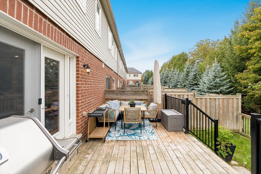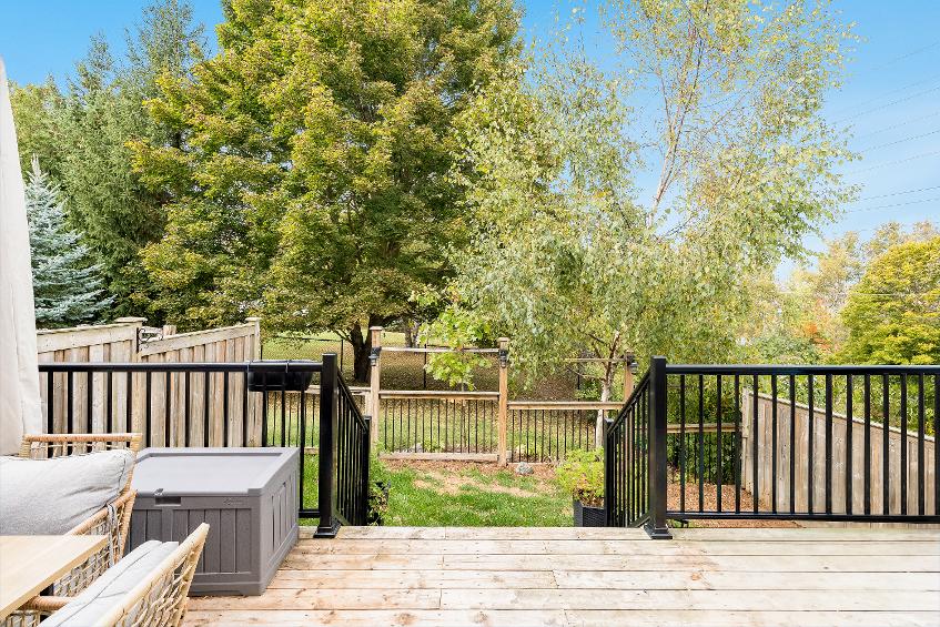 backyard equipped with a sizeable deck,surrounded bymaturetrees and lush greenery