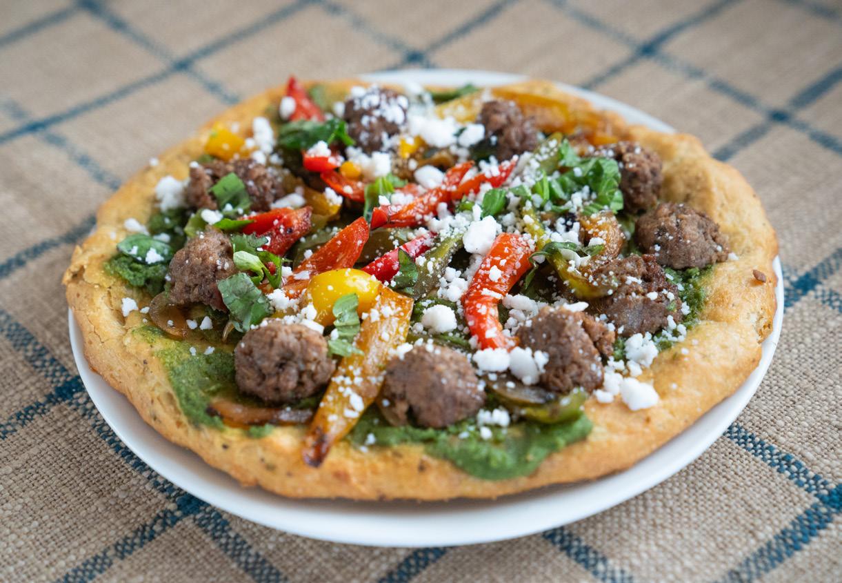 For pesto pizza baking & assembly: Place prepared pizza dough on baking sheet or pizza stone. Layer ingredients in the following order onto the dough: a thick layer of pesto, 1 Tbsp Parmesan, vegan meatballs, roasted tomatoes, bell peppers, more pesto, an additional ½ cup Parmesan, Italian seasoning, salt and pepper to taste, and a drizzle of olive oil. Bake on center oven rack for approximately 25 minutes, checking for desired crust.