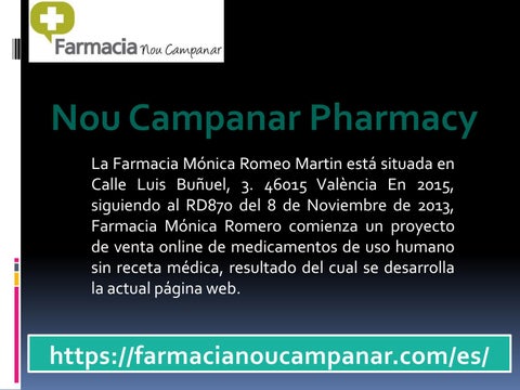 La Farmacia Mónica Romeo Martin está situada en Calle Luis Buñuel, 3. 46015 València En 2015, siguiendo al RD870 del 8 de Noviembre de 2013, Farmacia Mónica Romero comienza un proyecto de venta online de medicamentos de uso humano sin receta médica, resultado del cual se desarrolla la actual página web