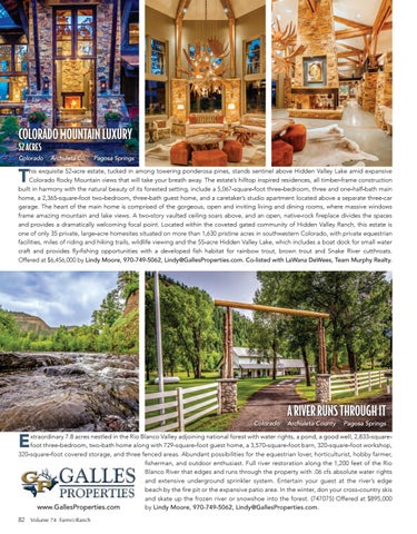 xtraordinary 7.8 acres nestled in the Rio Blanco Valley adjoining national forest with water rights, a pond, a good well, 2,833-squarefoot three-bedroom, two-bath home along with 729-square-foot guest home, a 3,570-square-foot barn, 320-square-foot workshop, 320-square-foot covered storage, and three fenced areas. Abundant possibilities for the equestrian lover, horticulturist, hobby farmer, fisherman, and outdoor enthusiast. Full river restoration along the 1,200 feet of the Rio Blanco River that edges and runs through the property with .06 cfs absolute water rights and extensive underground sprinkler system. Entertain your guest at the river’s edge beach by the fire pit or the expansive patio area. In the winter, don your cross-country skis and skate up the frozen river or snowshoe into the forest. (747075) Offered at $895,000 by Lindy Moore, 970-749-5062, Lindy@GallesProperties.com. www.GallesProperties.com 82 Volume 74 Farm&Ranch