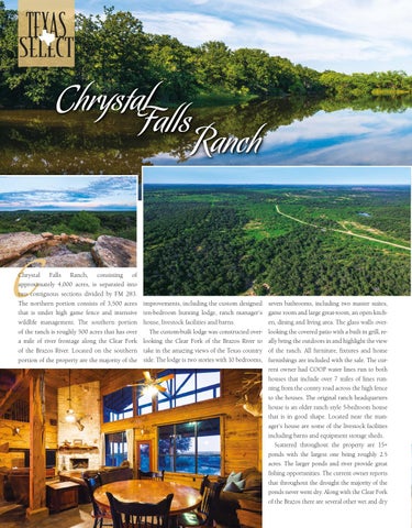furnishings are included with the sale. The current owner had COOP water lines run to both houses that include over 7 miles of lines running from the county road across the high fence to the houses. The original ranch headquarters house is an older ranch style 5-bedroom house that is in good shape. Located near the manager’s house are some of the livestock facilities including barns and equipment storage sheds. Scattered throughout the property are 15+ ponds with the largest one being roughly 2.5 acres. The larger ponds and river provide great fishing opportunities. The current owner reports that throughout the drought the majority of the ponds never went dry. Along with the Clear Fork of the Brazos there are several other wet and dry