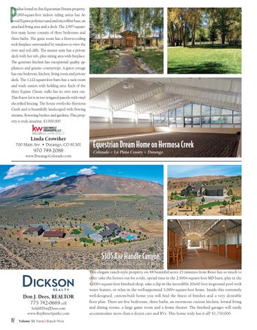 Paradise found in this Equestrian Dream property. A10,000-square-foot indoor riding arena has Atwood Equine polymer sand and microfiber base, an attached living area and a deck. The 2,907-squarefoot main home consists of three bedrooms and three baths. The great room has a floor-to-ceiling rock fireplace surrounded by windows to view the river and red cliffs. The master suite has a private deck with hot tub, plus sitting area with fireplace. The gourmet kitchen has exceptional quality appliances and granite countertops. A guest cottage has one bedroom, kitchen, living room and private deck. The 1,122-square-foot barn has a tack room and wash station with holding area. Each of the three Equine Classic stalls has its own turn out. This 8-acre lot is in two irrigated parcels with vinyl electrified fencing. The house overlooks Hermosa Creek and is beautifully landscaped with flowing streams, flowering bushes and gardens. This property is truly amazing. $3,000,000.