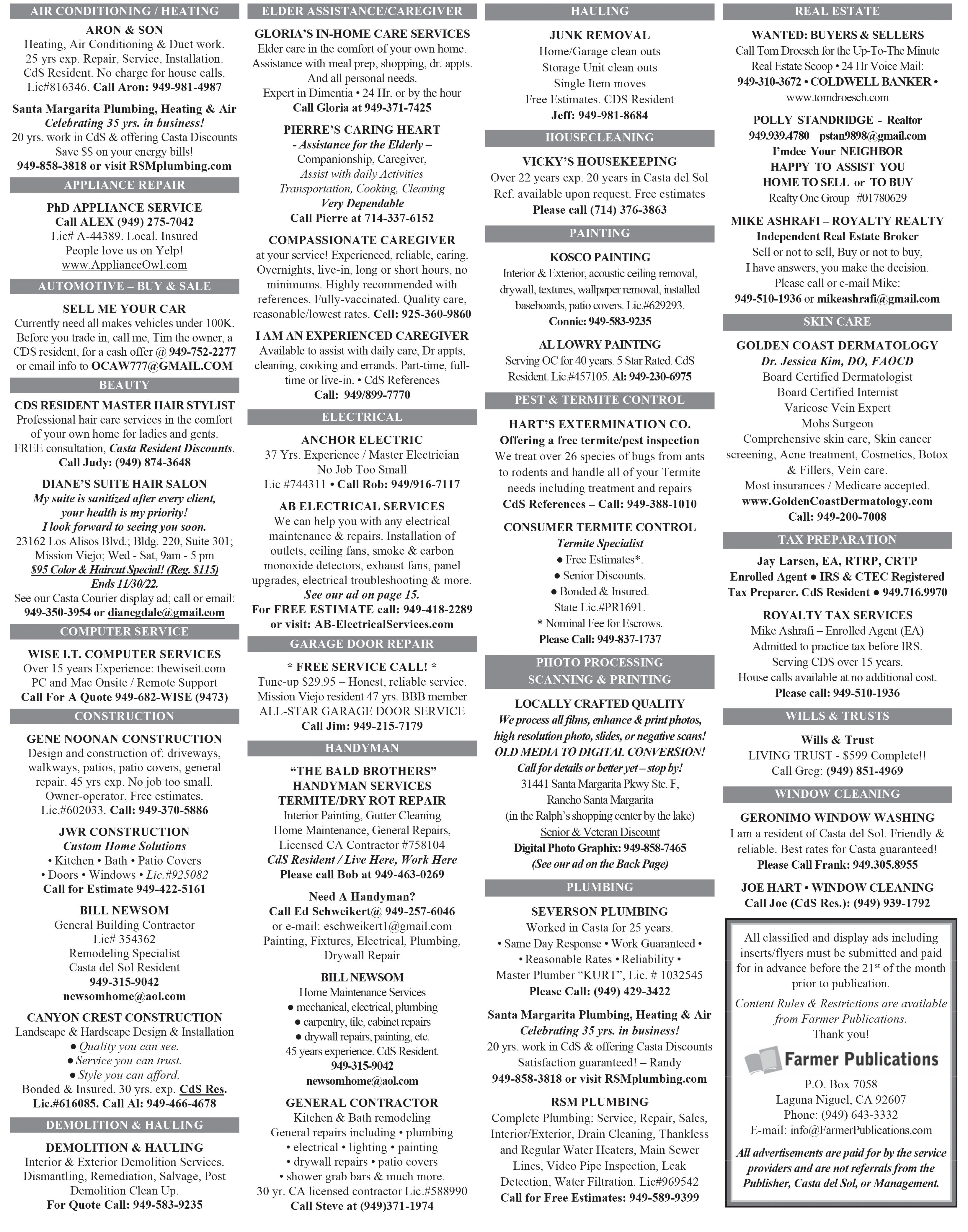 The Homeowners Association is not responsible for anyone advertising in either the Casta del Sol phone directory, or the Casta Courier. Owners must do their own due diligence.