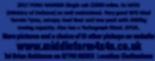 Call 01772 799500 and place your ad today A New Route to Market Browse. Sell. Buy at FGBuyandSell.com 2017 FORD RANGER Single cab 22000 miles. Ex MOD (Ministry of Defence) so well maintained. Very good BFG Mud Terrain Tyres, canopy. load liner and tow pack with 3500kg towing capacity. Also has a Tachograph fitted. £POA. More pictures and a choice of 10 other pickups on website www.middlefarm4x4s.co.uk Tel Brian Robinson on 07740 683113 Location Cheltenham MIDDLE FARM 4X4S
