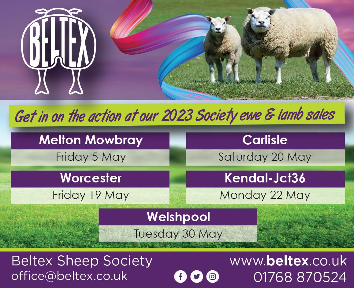 FGbuyandsell.com 26 | MARCH 1 2024 FGinsight.com Auctions & Breed Societies | March 1, 2024 FGbuyandsell.com 26 FGBuyandSell.com FG Buy and Sell 01772 799500 2024 SHOW & SALE DATES Scottish Club Spring Stars Show & Sale, Carlisle Monday, 18th March Dorset Diamonds EU Export Show & Sale, Ballymena Saturday, 23rd March May Fair, Exeter Tuesday, 7th & Wednesday 8 th May Llandovery Show & Sale Saturday, 29th June Worcester Show & Sale Saturday, 13th July Lanark Show & Sale Thursday, 18th July 52nd NI Annual Premier Show & Sale Monday, 29th July Skipton Show & Sale Saturday, 3 rd August 9th NI Annual Omagh Show & Sale Friday, 9th August NI Swatragh Show & Sale Friday, 23 rd August Carlisle August Show & Sale Friday, 30th August 35th NI Annual Autumn Sale Monday, 14th October For further enquiries contact: The Breed Secretary 01305 262126 Email: dorsetsheep10@outlook.com Cheviot Sheep Society Soutth h Coouuntrry Cheviiots Sale of Ewes, Gimmers & Ewe Lambs 30th September 2024 at Longtown Mart Rams at Lockerbie Mart 14th October 2024 01848 331 758 / 07715 409 170 secretary@cheviotsheep.org www.cheviotsheep.org Cheviot South Co Sale of Ewes Gimmers & Ewe Lambs 30th September 2024 at Longtown Mart Sale of Rams at Lockerbie Mart on 14th October 2024 For more information, please contact, Rob McTurk 01848 331 758 / 07715 409 170 secretary@cheviotsheep.org Sale of Ewes, Gimmers & Ewe Lambs 30th September 2024 at Longtown Mart Sale of Rams at Lockerbie Mart on 14th October 2024 For more information, please contact, Rob McTurk 01848 331 758 / 07715 409 170 secretary@cheviotsheep.org www.cheviotsheep.org B info@pedigreelivestockservices.co.uk T 01768 870523 f BADGER FACE TEXEL SHEEP SOCIETY PERFORMANCE PERFORMANCE PROFIT PROFIT POTENTIAL POTENTIAL The Suffolk Advantage The Suffolk Advantage E: enquiries@suffolksheep.org Any Mule X Suffolk Any Mule X Suffolk = = Suffolk sired lamb increases your flock W: www.suffolksheep.org T: 028 2563 2342 EXETER LIVESTOCK CENTRE, MATFORD PARK ROAD, EXETER, DEVON, EX2 8FD