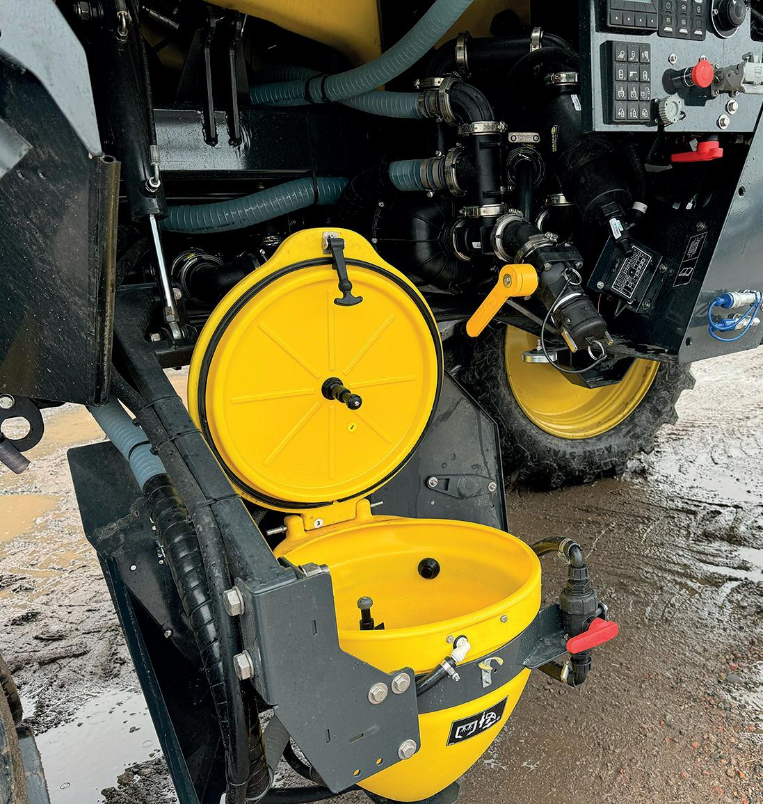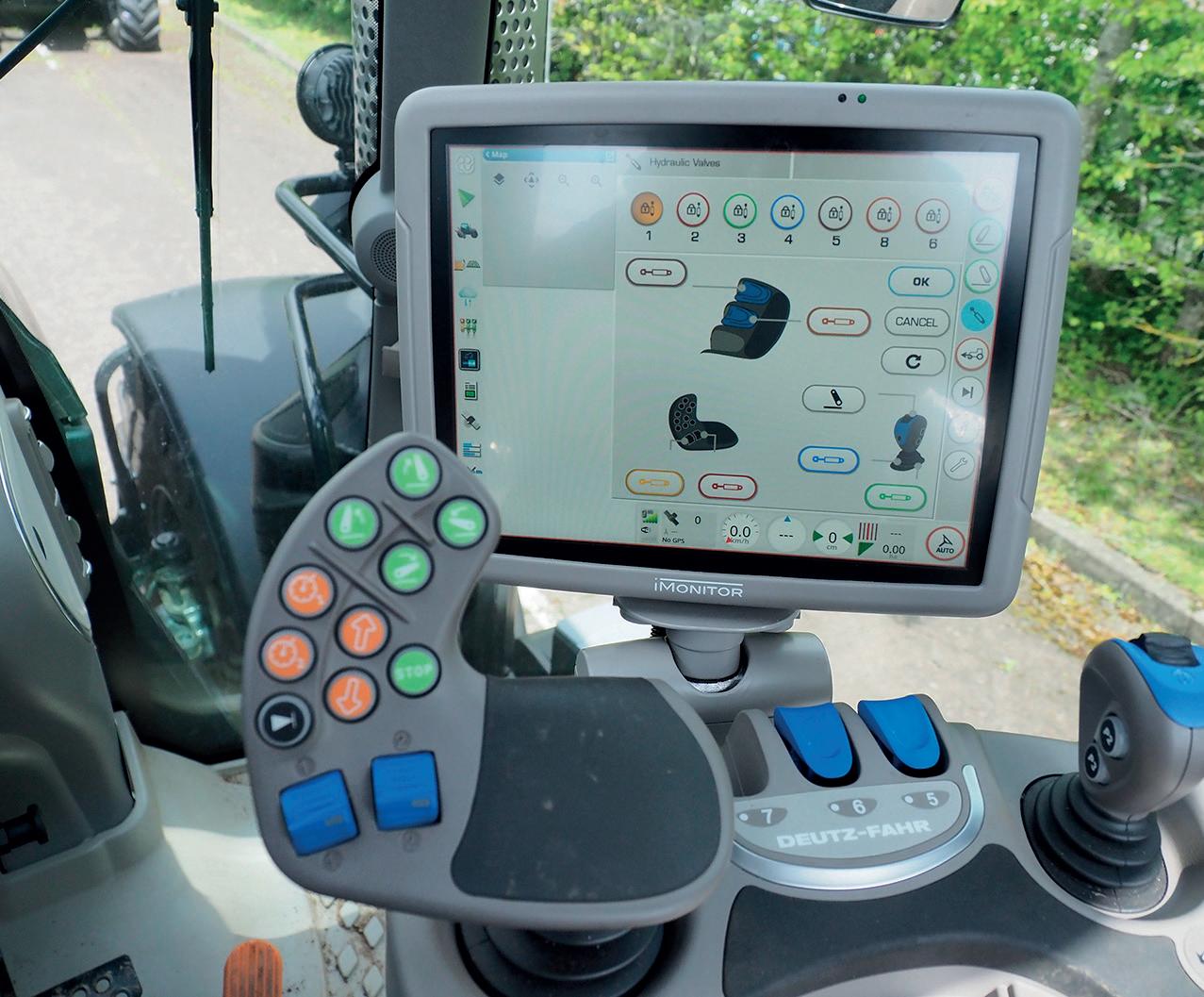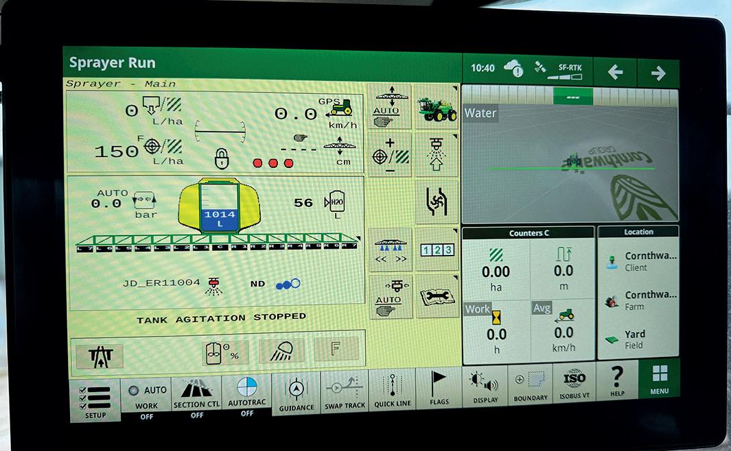 There is just enough room on the roof for a GPS receiver, with the machine using a Starfire 6000 dome, feeding a John Deere universal terminal that sits above the tractor’s SmartTouch terminal.