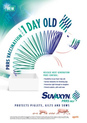 Further information is also available from the Summary of Product Characteristics or please contact your veterinary surgeon, or Zoetis UK Ltd, Walton Oaks, Dorking Road, Tadworth, Surrey KT20 7NS. POM-V www.zoetis.co.uk Customer Support: 0845 300 8034. Suvaxyn PRRS MLV contains Modified Live PRRS, strain 96V198. Use medicines responsibly (www.noah.co.uk/responsible). Date of preparation November 2017. AH774/17