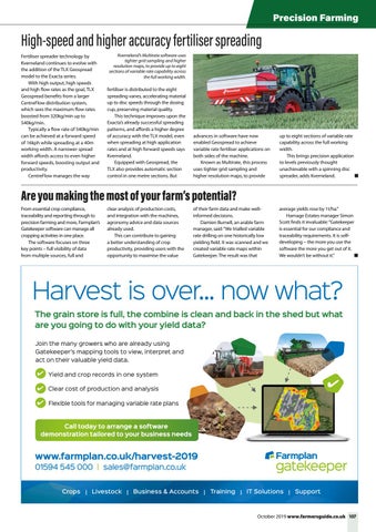 of their farm data and make wellinformed decisions. Damien Burnell, an arable farm manager, said: “We trialled variable rate drilling on one historically low yielding field. It was scanned and we created variable rate maps within Gatekeeper. The result was that