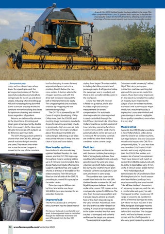 styling from larger CR-series models, including dark blue operator and passenger seats. A refrigerator below the passenger seat is standard and there is also a smaller drinks cooler in the roof panel. A new Nav 900 GPS receiver is fitted for guidance, and it also includes angle and attitude measurement for terrain compensation. For automatic steering an electric steering wheel is used, controlled through the IntelliView 4 terminal. Like other New Holland machines, joystick control of travel and key operating functions is convenient, and the stick returns automatically to centre as soon as it is released. All harvesting controls are similar to other New Holland combines in the current range.