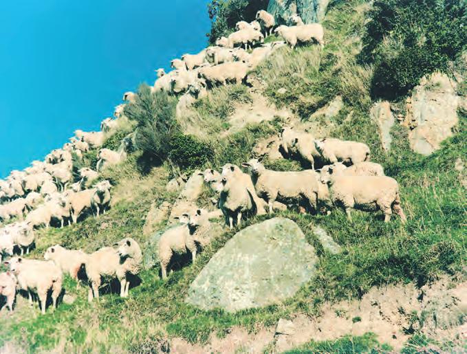 Romney ewes with ram lamb sire, 1986 (above left) and purebred Nudie and first-cross Nudie hoggets at Wairere, May 2023