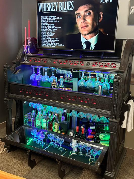 Besides her fireplace, another masterpiece is an amazing, one-of-kind TV/stereo home entertainment unit with a bar –all housed in an antique church pump organ. Lisa and her boyfriend, Terry Woodky, were inspired by similar pieces they’d seen people make with pianos. But old organs weigh a whole lot less than old pianos.