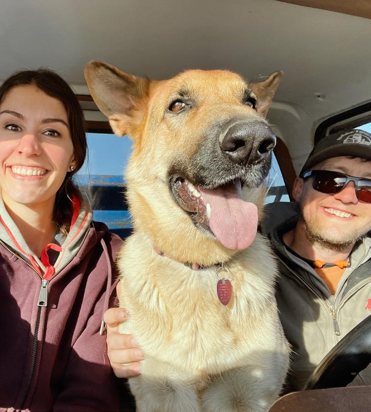 Sasha and Phil never get too close together in the pickup because their sidekick Nala is always there. They describe her as “our first child.” The German shepherd isn’t a trained cattle dog, but likes to help. She does her best to keep the cows back off the gate. She doesn’t nip at the cows, but actually pushes them with her paws. Nala was clipped by a car last year, shattering her femur and dislocating the other hip. To see her running, chasing the squirrels and rabbits again is “pretty phenomenal.”