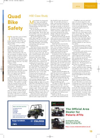 then decided to move onto the next field. He rode 300 yards down a public road and then turned into the next field. As he did so, the battery powering the twitcher on the front of the ATV moved slightly and he leaned forward to secure it. As a result, the vehicle veered onto a slight bank and overturned, hitting the butt of the shotgun, which went off, firing both barrels into Mark’s right leg. Mark had not been aware that the safety catch just protected the triggers and would not prevent the gun firing pins releasing if the weapon was struck hard in any way. Mark had been away from the house for about three quarters of an hour. “I was conscious, in great pain and losing a lot of blood. I tried to get myself up but couldn’t stand and I couldn’t summon help because my mobile phone battery was flat.” Fortunately for him, his father had received a message at the farm to say that some sheep had escaped and, unaware that his son was lying gravely injured, he came down to the fields to look for them. He was horrified to find Mark lying under the ATV and used a leather belt to put a tourniquet on the leg to stem some of the bleeding. He summoned help and RAF Boomer sent a rescue helicopter to take Mark to hospital at Asherton. Surgeons operated throughout the night but were forced to amputate the leg at the thigh to save his life, although his parents and girl friend at the time were warned that this still might not be enough to save him. He had four or five further operations during the following weeks. The impact on Mark’s life and the farm business was huge. He was unable to work for over a year and still suffered pain and weakness when he was able to return. He had to take 14 tablets every day and had to learn to walk again. He still faces more operations on his leg. Mark says the accident put the farm under major financial strain.