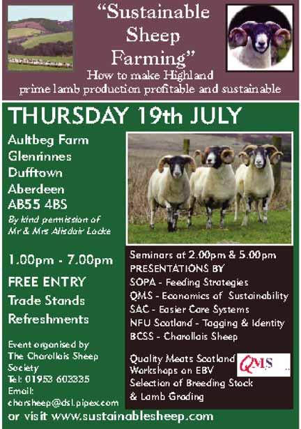 The Charolais Sheep Society is celebrating 30 years in the UK and is hosting a Sustainable Sheep Day at Glenrinnes near Dufftown. With forty trade stands, speakers and