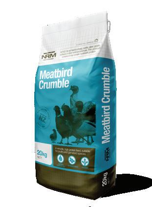 Growing meat chickens, turkeys and waterfowl: Feed NRM Meatbird Crumble ad lib from day old until slaughter. Mature turkeys, ducks and geese: Feed ad lib with ad lib access to oyster or limestone grit and cracked or rolled grain.