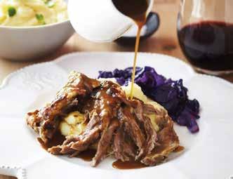 9. Serve with creamy potato and parsnip mash, red cabbage and gravy.