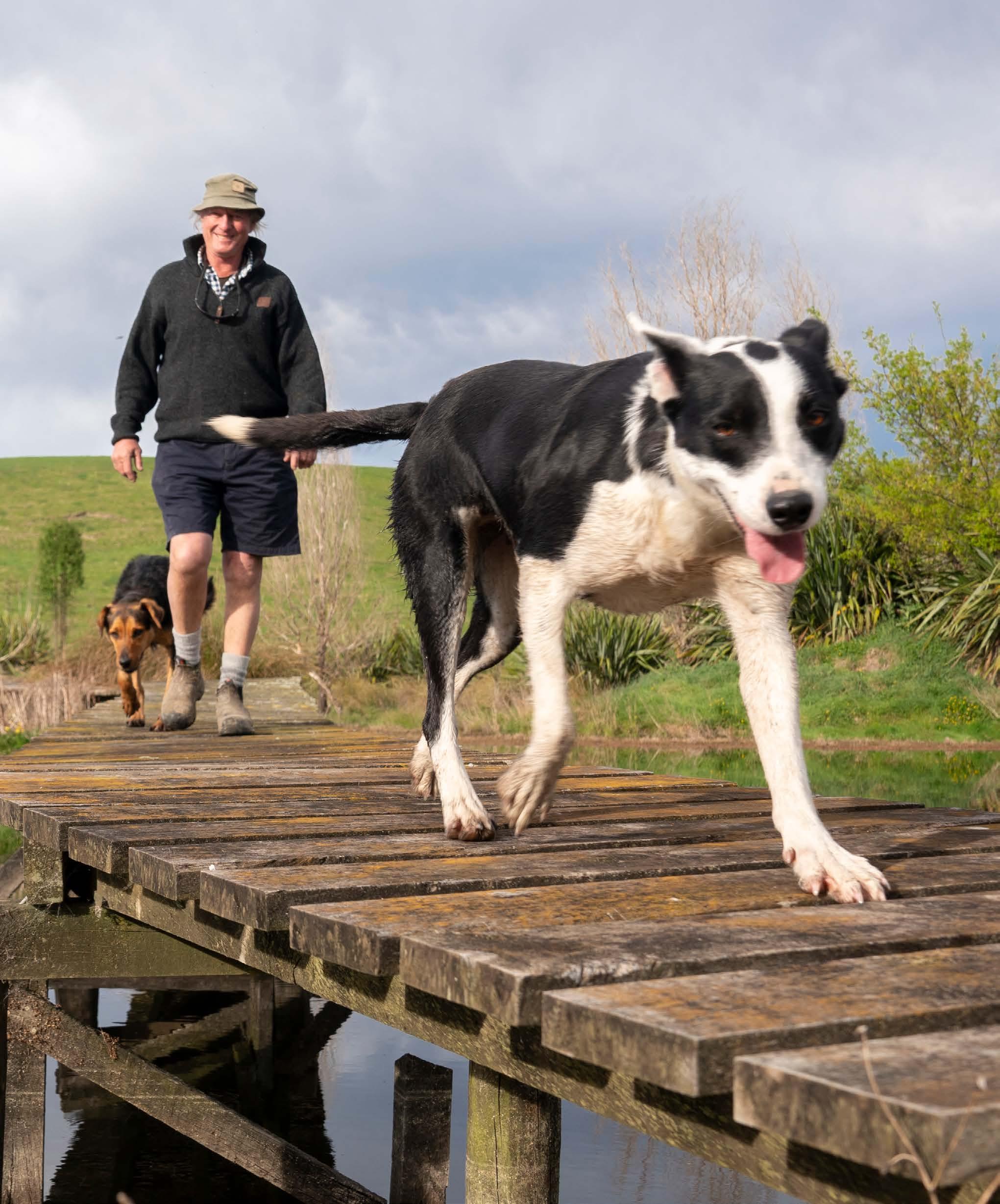 James Hunter with his dogs on Rangitoto Station near Porangahau.