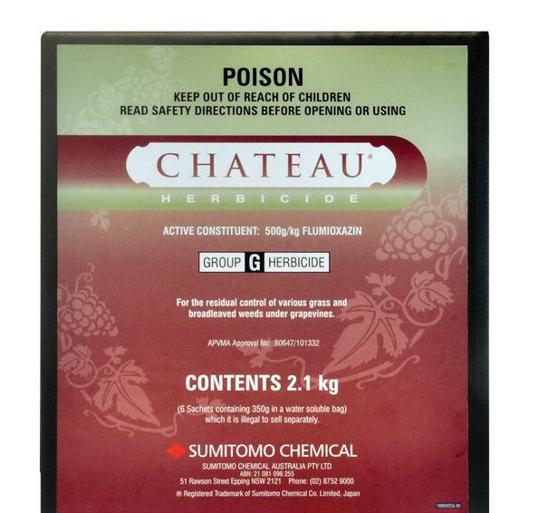 Chateau needs to be applied in late winter or early spring to bare ground in the herbicide strip. For best results good preparation is essential, with any established weeds in that strip being sprayed and allowed to die down completely before Chateau is applied. Any established perennial weeds like mallow, dandelion, white clover and perennial ryegrass need to be dealt with using an appropriate herbicide as Chateau will not kill established weeds. If such weeds , trash, mulch or prunings are present, this will prevent Chateau from reaching the ground and creating a consistent protective layer which prevents seedlings germinating.