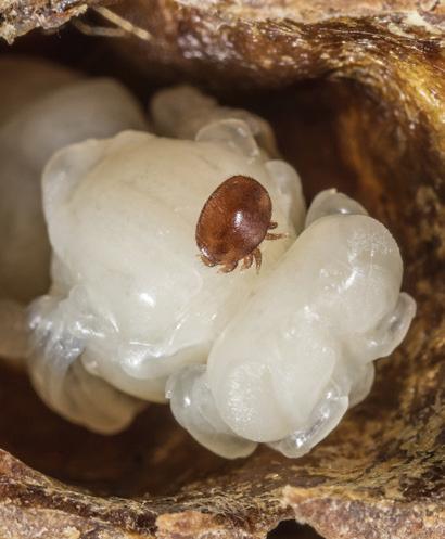 • Steep reduction in the raising of drones later in the fall, which causes a transfer of Varroa from the drone brood to the worker brood. This more highly infested fall worker brood will emerge to serve as the colony’s winter bees.