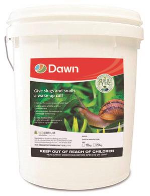 Slug-em is a natural surfactant and is compatible with commonly used pesticides and can be applied using conventional spraying equipment. It works by removing the slime layer from molluscs and leads to rapid dehydration and death. It also provides a strong repellence and anti-feeding action of sprayed plant parts. Slug-em is applied at rates from two to five litres per hectare. Dawn is a high-performance slug and snail pellet with a unique coating process. The pellet contains iron which is bound