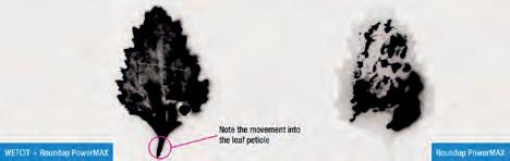 • 15 minutes after application, the WETCIT plus Roundup PowerMAX combination had distributed entirely throughout the leaf and had begun to translocate into the petiole. In comparison, Roundup PowerMAX alone was still yet to distribute throughout the leaf and no translocation had begun.