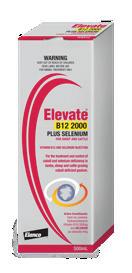 Zapp Encore 20L $710.00 SAVE $61.99 • For the knockdown and long-term control of body lice. • For long-term flystrike protection in coarse wool breeds. • Scourable blue dye to help easily identify treated animals. Cydectin Oral Drench range 15L $478.00 SAVE $60.00 • Protect from parasites for longer. • Grow lambs faster. Reduce worm build up on pasture. 1001765, 1000458 / A006204, A006204 Elevate B12 2000 Selenium 500ml Maintain growth.
