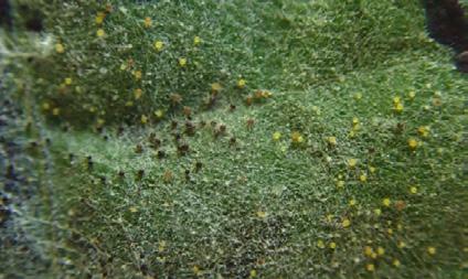 The initiation of cleistothecia sees the asexual sporulation stop in powdery mildew colonies. Once initiated, cleistothecia start out white, turn yellow, brown then finally black and once there is necrosis of the anchoring hyphae they are considered mature. Erysiphe necator cleistothecia can contain up to 36 ascospores. Once detached, the fruiting bodies are dispersed by rain splash onto bark, trunk, leaf litter and soil. Ascospore survival is consistently higher in exfoliating bark.
