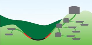 The troughs located on the other side of the system’s low point at 225 metres ASL required the strategic location of a break pressure tank above this height on the opposite side of the valley. This