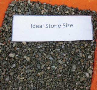 “Large stones (AP25 to 50), leave large air spaces, encouraging soil movement into the trench profile through compaction and fines migration from the sides and top of the trench. Larger aggregate also tends to be less stable and can move and settle over time, damaging the drainage pipe and/or causing trench slumping, leading to drainage system failure.