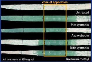 | The picture clearly shows how Acanto® (picoxystrobin) moves in the leaf to protect new growth compared the trifloxystrobin. Acanto® can also move from the vapour phase into