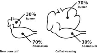 offering high quality hard feed to calves, which encourages papillae development in the rumen and the establishment of a microflora population essential for the fermentation of high fibre feeds. The digestive system proportion change that occurs during the calf rearing process: