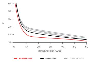 Independently reviewed New Zealand research1 shows Pioneer brand inoculants improve fermentation speed and quality. Six pasture silages were inoculated with five commercially available silage inoculants. Pioneer brand 1174 had a greater rate of pH decline1. There was no difference between other brands and the untreated control1