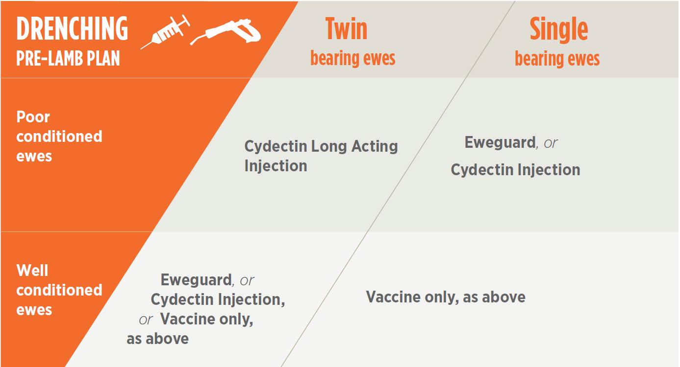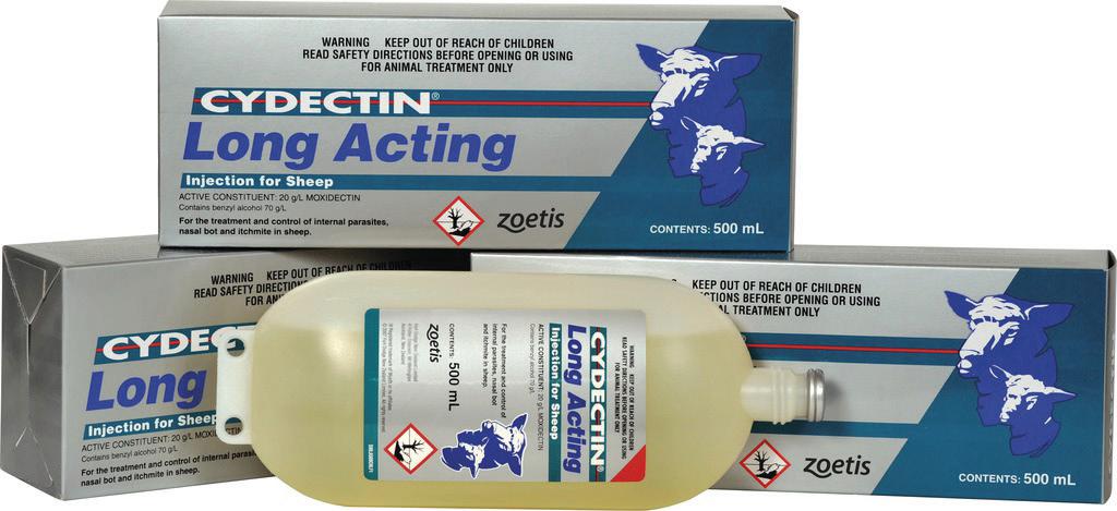 development of drench resistance. The logical treatment choice for twin bearing ewes that are in poor body condition is a long acting product, e.g. Cydectin Long Acting Injection. Medium acting products such as Eweguard® can be used on single ewes that are in poor condition. Good conditioned ewes should not need drenching if feed levels are adequate. However, where feed levels are poor, good conditioned twin ewes may benefit from a medium acting treatment.